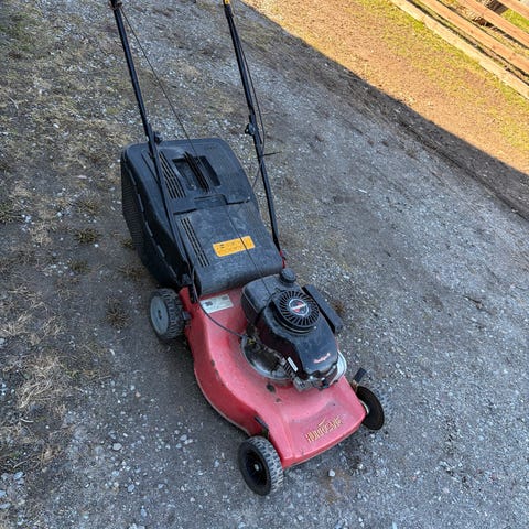 Bensindriven gräsklippare i röd färg med fyrhjulskonstruktion och handtag med bygel. Motorn är monterad ovanpå klippdäcket och startas med snöre. Klipparen har manuell framdrivning och lämpar sig för klippning av gräsmattor i trädgård eller på tomt. Ingen uppsamlare syns på bilderna, utan gräset sprids ut bakom eller under maskinen. Uppsamlare finns. Tyvärr har drivningen slutat fungera men går säkert att fixa för den händige. Startar jättesnällt och klipper som en gud.