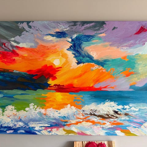 Abstrakt tavla i tre delar med motiv i starka färger. Målningen har inslag av blått, gult, rosa, vitt och svart med dynamiska linjer och former. Passar som väggdekoration i exempelvis vardagsrum, sovrum eller kontor. Varje del är rektangulär och tillsammans bildar de ett sammanhängande motiv när de hängs bredvid varandra.