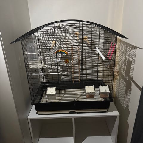 Fågelbur i metall på ställning. Buren är rektangulär med flera sittpinnar och leksaker inuti. Underdel med galler och uppsamlingsbricka för enklare rengöring. Passar för mindre till medelstora burfåglar. Buren är försedd med dörrar framtill för åtkomst vid matning och skötsel.
