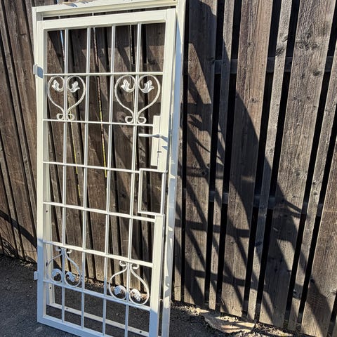 Säkerhetsdörr i stål till ytterdörr. Vet ej om funkar, ingen nyckel. Bortskänkes vid hämtning.