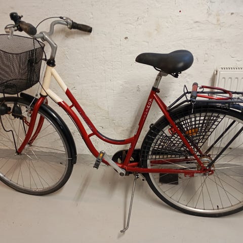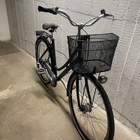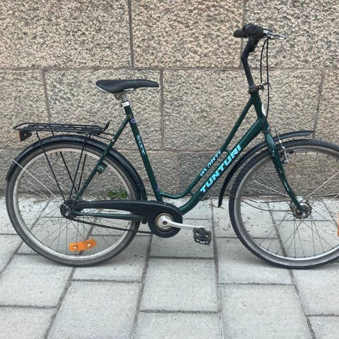 En damcykel av modellen Tunturi Tango säljes. Cykeln har punktering på ena däcket och säljes i befintligt skick. Den har 7 växlar, fotbroms bak och handbroms fram. Cykelkorg och pakethållare.