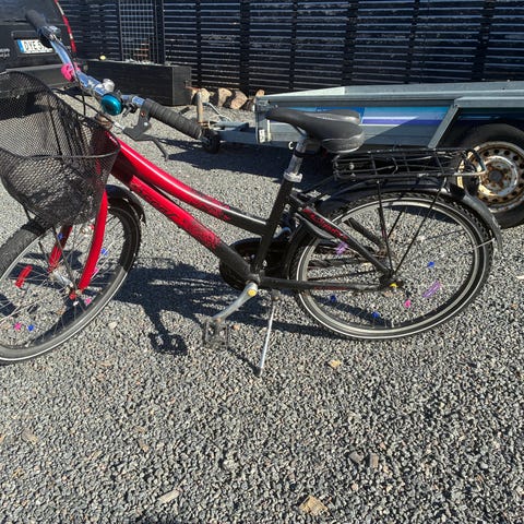 Peak Barncykel med 24" hjul i vit färg. Utrustad med fram- och bakskärmar, kedjeskydd, pakethållare bak samt framkorg i metall. Passar barn som behöver en cykel i 24-tumsstorlek. Använd och lite ytlig rost, se bilder.