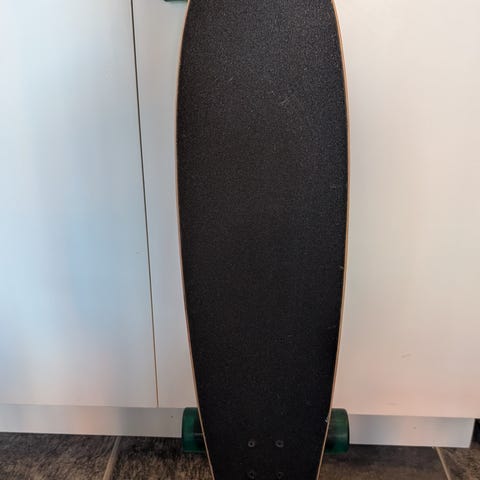 Mountainboard med bräda i trä och grovmönstrade hjul anpassade för åkning på ojämnt underlag. Utrustad med fotbindningar för stabilitet och kontroll. Passar för terrängåkning, downhill och freestyle på grus, gräs eller annan hårdare mark.