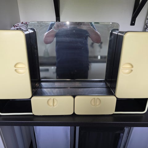 Fint vintage-skick med naturlig patina. Plasten är hel men har lite spår av användning, vilket bara förstärker den genuina retrokänslan. Spegeln är i bra skick.