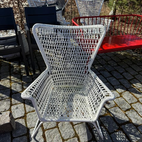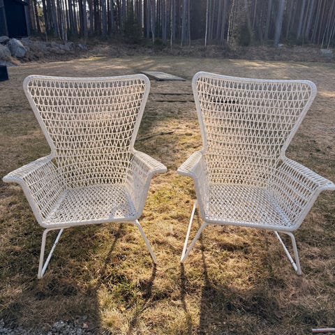 Ett par fåtöljer och fotpallar, HÖGSTEN, från IKEA. Renoveringsbehov, då flätningen börjat släppa, mest vid armstöden. Har även rostfläckar. Fotpallarna ser däremot bättre ut. Även dom har några rostfläckar.