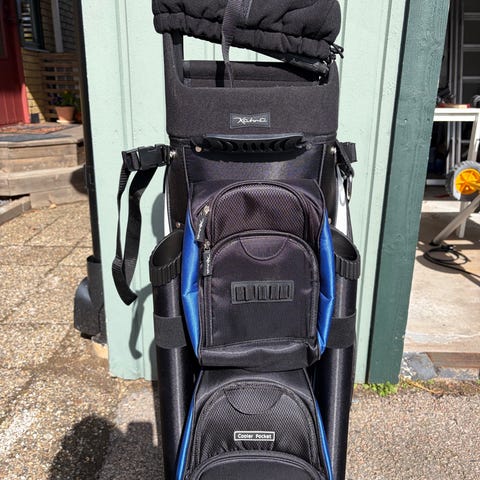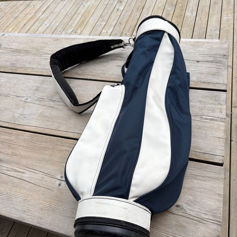 Jones Sports golfbag i beige och svart färg. Klassisk bärbag med axelrem och flera fickor för förvaring av bollar, peggar och tillbehör. Bagen har också ett kylfack för drickor. Stabil botten med Jones Sports Co.-märkning.