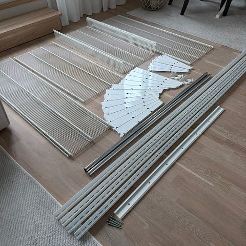 8 trådbackar och 7 trådhyllor. Två fullhöjds hyllor, delbara.