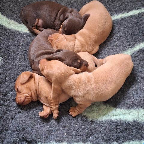 Fem bruna labradorvalpar söker egna hem. 4 tikar och en hane. Födda 12/3 och säljs vid 8 veckor, dvs 7/5.