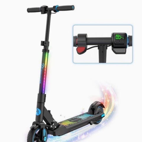 RCB elsparkcykel för barn. Modellen på bilderna visar två sparkcyklar i färgerna svart och rosa med detaljer i turkos. Båda har större framhjul, mindre bakhjul och fotbroms på bakhjulet. Styret är rakt med handtag i gummi och elsparkcykeln har ett lågt ståbräde. På en av produktbilderna anges att modellen är avsedd för barn i åldern cirka 6–12 år. Konstruktionen är hopfällbar för enklare förvaring och transport.