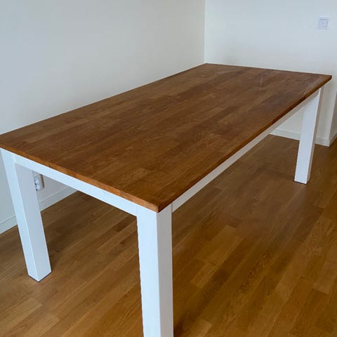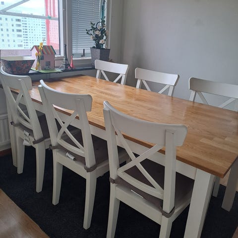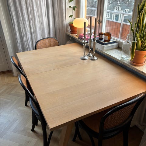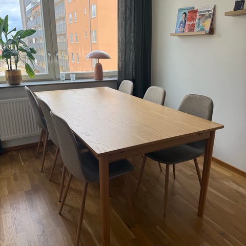 Matbord och 8 stolar i ek från Mio, köpt 2021.