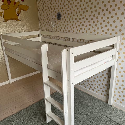 IKEA STORÅ loftsäng i vitbetsad träfinish. Stabil stomme med stege på sidan och skyddande sarger runt övre bädden. Konstruktionen ger plats under sängen som kan användas till exempelvis skrivbord, förvaring eller sittplats. Mått: totalhöjd ca 184 cm, längd ca 213 cm och bredd ca 153 cm. Passar standardmadrass med motsvarande mått som STORÅ-serien är avsedd för , resårmadrass ingår men inte bäddmadrass. Min säng har lite skavanker. Där av priset. Stegen har en flisa och på en av kortsidorna har en bräda gått sönder så vi har lagat och jag har sågat av benen 30 cm så den får plats till ett 2,40-tak. Men inget av detta påverkar funktionen alls. En bra säng som har mycket kvar att ge.