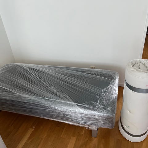 Hilding Original 90 cm-säng i grått tyg. Madrassen är medel komfort och är tillverkad i Sverige. Sängen har ben i vit färg. Tyget runt madrassen kan tas av och tvättas. Bäddmadrass ingår ej.