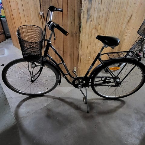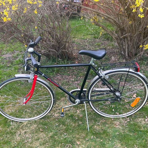 Herrcykel med rostfria skärmar och hjul. 10 växlar. Har stått några år och behöver lite omvårdnad. Korg. Lås