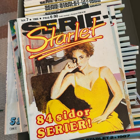 Starlet serietidningar samling från år 1974. Flera nummer ur serien ”Starlet – Din tidning” syns på bilderna, med ryggar märkta med respektive nummer och årtal 1974. Omslagen visar typiska illustrationer och fotografier från perioden. Passar för den som samlar på äldre serietidningar eller vill komplettera en befintlig Starlet-samling.