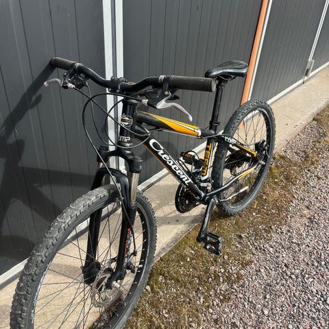 Scott Scale 24 Disc barncykel/MTB med 24" hjul. Cykeln är grå/orange, har 7 växlar, dämpad framgaffel, skivbromsar fram och bak och flaskhållare. Använd men i okej skick.