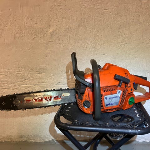 Husqvarna 346XPG motorsåg med 13’ svärd och kedja från Husqvarna. Sågen har fungerade handtagsvärme och är i bra bruksskick. Köptes av mig 2003 av återförsäljare som servat och gått igenom sågen och har sedan dess använts av mig ca: 2 timmar vart fjärde år. På bilderna syns även tillbehör som kombinyckel, filverktyg och kedjeskydd. Lämplig för kapning av ved och allmänt skogs- och trädgårdsarbete.