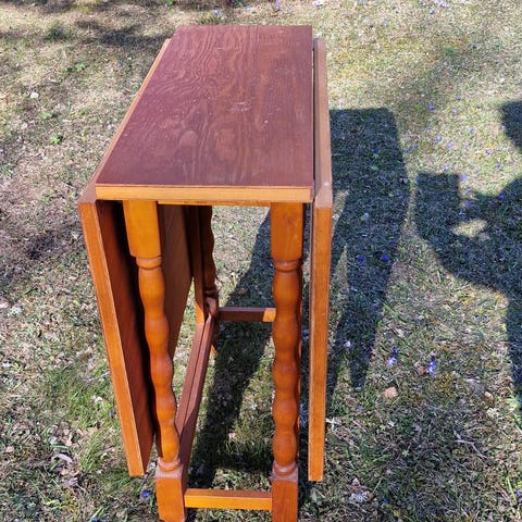 Matbord klaffbord i trä Furu träyta. Bordet har oval form när klaffarna är uppfällda och kan göras mindre genom att fälla ned klaffarna. Passar som matbord eller köksbord i exempelvis kök eller matrum.
