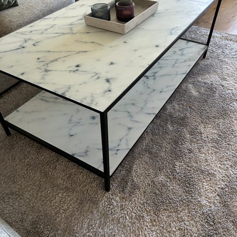 Soffbord från Mio. Svart smide och glas. 80 x 80 cm. 45 cm högt. Glasskivorna är löstagbara. Finns små repor i glasskivorna.