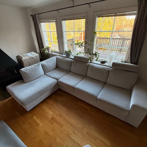Säljer vår bekväma Nevada 4-sits soffa med divan (vänster) i färgen Grå, 2 st nackstöd ingår.