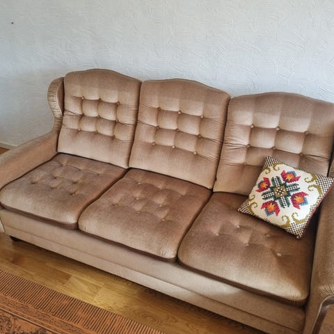 Säljer en stabil och bekväm 3-sits soffa i klassiskt manchestertyg (ribbat tyg).