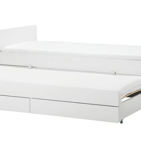 90cm säng med en utdragbar extra säng under. Fint använt skick, någon skav i trät på ena plankan. Se foton. Madrasser och ribbotten kan medföljas, dock har några av ribborna gått sönder i en av ribbottena. Dock har vi använt den i extrasängen vid fötterna och således gått att fortsätt använda.