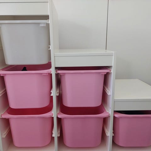 IKEA barnförvaring med plastlådor vit/rosa