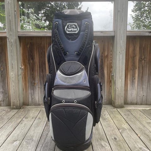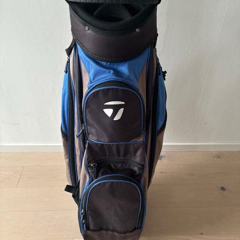Wilson Playerfit golfbag i blått och svart. Vagntyp med flera fack för klubbor samt flera ytterfickor för tillbehör. Bärhandtag upptill och på sidan för enkel hantering. Passar för användning på golfvagn eller cart på golfbanan.