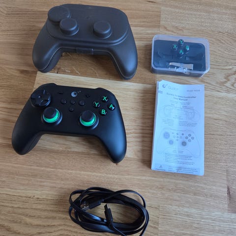 Steam Link med tillhörande handkontroll i svart färg. Paketet inkluderar strömadapter och kablar enligt bild. Enheten används för att strömma spel från dator till TV eller annan skärm via nätverk. Handkontrollen är utformad för PC‑spel med styrspakar, knappar och styrplattor anpassade för Steam-plattformen.