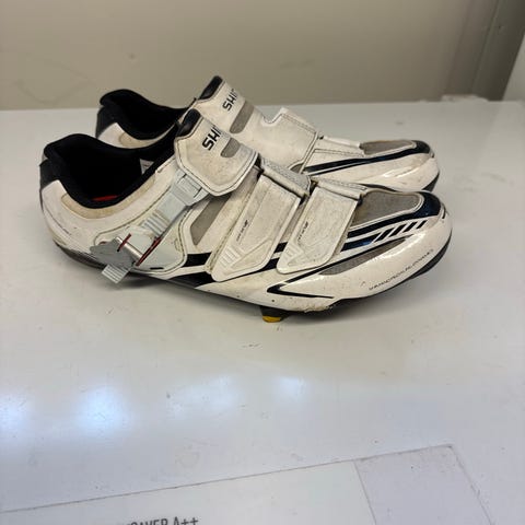 Skorna är utformade för landsvägscykling och har ovandel i syntetmaterial med blank svart yta och röda detaljer. De stängs med tre remmar, varav en med spänne för justerbar passform. Sulan är styv och anpassad för landsvägspedaler med klickfästen. Lämpliga för cyklister som söker landsvägsskor i storlek 45. Även nya klickfästen medföljer, se bild.