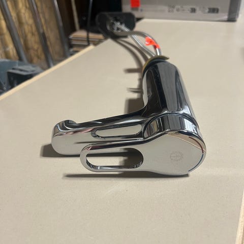 Blandare i kromfärgad metall för badrum eller kök. Modellen har ett modernt, runt utförande med två öppningar framtill och anslutande elkabel, vilket tyder på elektronisk funktion, till exempel beröringsfri eller med sensor. Passar för installation i tvättställ eller bänkskiva där elanslutning finns tillgänglig. Exakta mått, fabrikat och modellbeteckning framgår inte av underlaget.