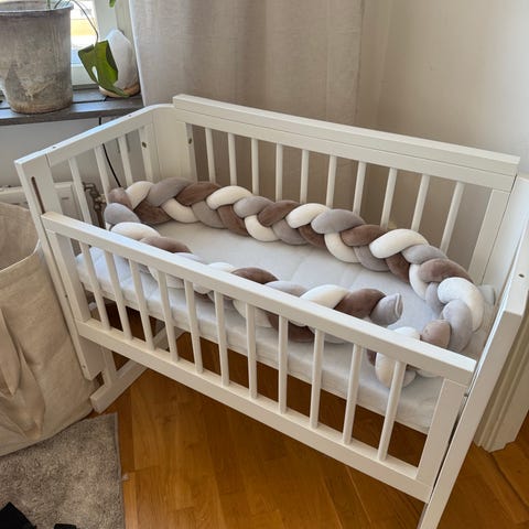 Vi har målat om sängen och bytt ut hjulen mot mer stabila hjul. Lite kantstött, men ingenting som påverkar funktion eller säkerhet. Sängen är köpt begagnad och använd av ett barn, madrassen är nyköpt och madrasskyddet är nyköpt.