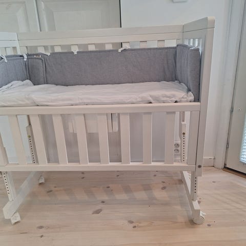 Snygg bedside crib från Troll i vitlackat trä – perfekt för att ha bebisen nära under nätterna. Sängen är utformad för att stå intill föräldrarnas säng med öppningsbar sida för enkel åtkomst.