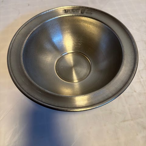 Träckt, handslagen skål, vågig kant, tjocka sidor och botten 2,5 mm, RKS = Rolf Karlsson, *1947 Stockholm, Kattfot = kontrollstämpel, S = Silver, Z9 = 1974, Signerad: Karlsson R, Diameter 11,5 cm, höjd = 4,5 cm, vikt = 291 gram.
