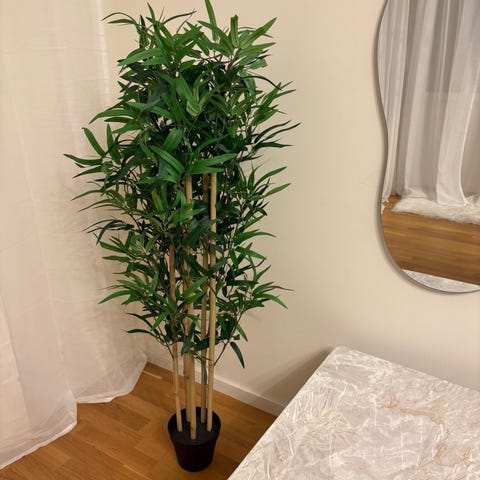 Krukväxt i form av palm med gröna blad i svart kruka. Passar som inomhusväxt i vardagsrum, sovrum eller hall. Växten ger ett grönt inslag och kan placeras på golvet intill vägg eller fönster.