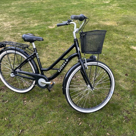 Flickcykel 26" hjul. Märke ultra. Cykeln har röd ram, lågt insteg, pakethållare bak och korg fram. Utrustad med skärmar och standardbromsar.