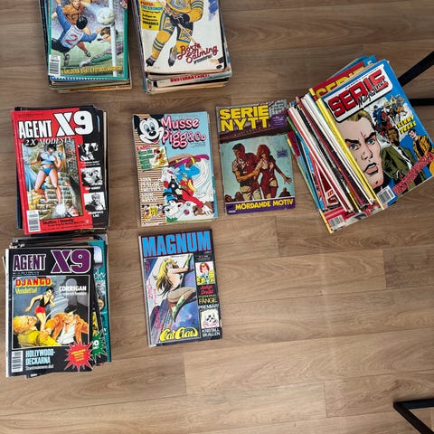 Antal: 16 tidningar (En rejäl hög med nostalgi). Beskrivning: "Stort läspaket med Agent X9 från 80- och 90-talets storhetstid. Här får du en komplett blandning av världens bästa agent- och deckarserier. Mycket välvårdade exemplar som förvarats torrt och plant.