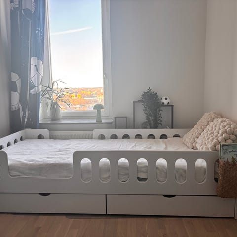 Säljer vår dotters Hussäng i grått, två bra lådor under på hjul. Den är 180x80, en bra tjock madrass medföljer inköpt för ca 1 år sedan (ca 13 cm).