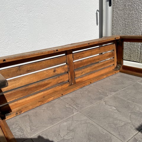 Vit trädgårdsbänk i metall. Bänken har ryggstöd med spjälor och armstöd på båda sidor. Passar för placering på balkong, altan eller i trädgård som sittplats för flera personer. Bredd ungefär 150cm. Pulverlackad plåt.