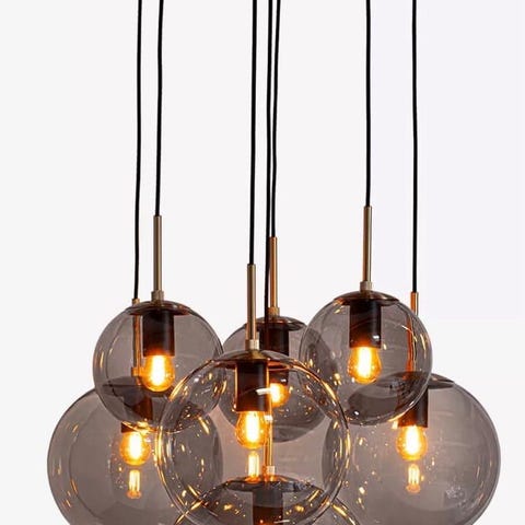 Bolia taklampa med 9 stycken pendlar rökt glas. Ett av glasen saknas, går att beställa på hemsidor för bra pris.