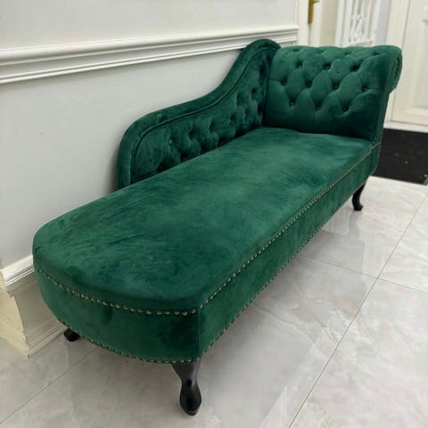 Säljer en exklusiv vänstervänd schäslong och matchande fåtölj i svart sammet, klassisk Chesterfield inspirerad stil med dekorativa nitar.
