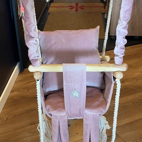 Babygunga i röd plast. Sparsamt använd. Rep i gott skick.