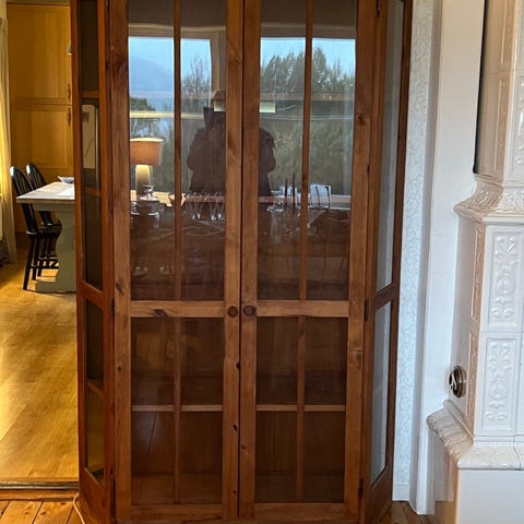 Jysk vitrinskåp med två glasdörrar och träram i brun nyans. Skåpet har flera hyllplan för förvaring och exponering av exempelvis porslin, glas eller prydnadssaker. Nedre delen av dörrarna är i trä med vertikala paneler, medan den övre delen är i glas för insyn. Passar i vardagsrum, matsal eller kök som förvarings- och vitrinskåp.