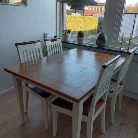 Bordet är avlångt och passar för flera sittplatser, lämpligt för kök eller matrum. Bordet och stolarna är väldigt stabila.