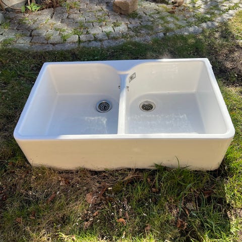 Diskho i vit porslin med klassisk, hög köksblandare i krom. Enkel ho med avrinningshål och korgventil i botten. Passar för inbyggnad i bänkskiva i kök eller grovkök. Blandaren har separat vred/handtag och svängbar pip för användning vid disk och rengöring.