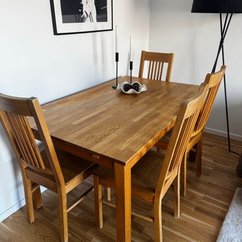 Skänkes Matgrupp träbord med fyra stolar trä beige sits