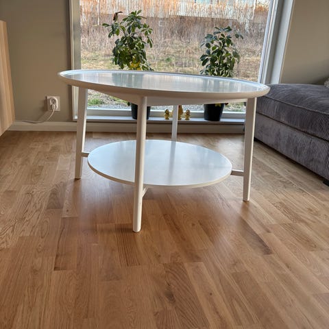 Soffbord med måtten 76x76 cm höjd 45 cm , tungt och stabilt, är inköpt på MIO.