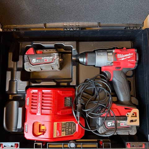 Obs står Berner på maskinen och den är blå men detta är en MILWAUKEE M18 FPD2 med 2 batterier, laddare och låda.