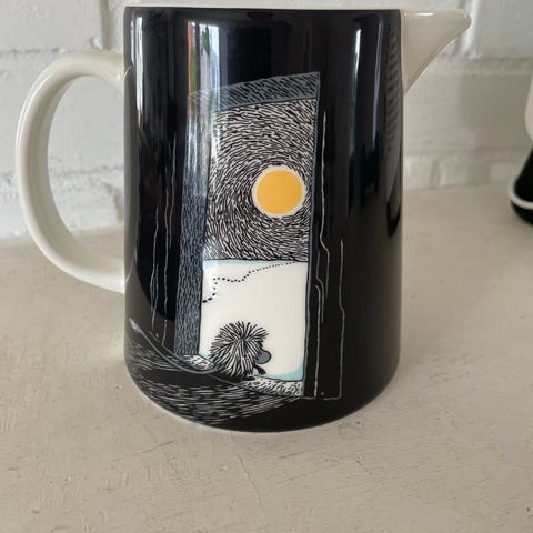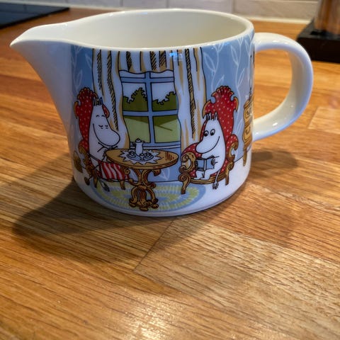 Arabia Mumin kanna i porslin med motiv från Mumin. Kannan har pip och handtag och lämpar sig för servering av till exempel mjölk, sås eller andra drycker vid bordet.