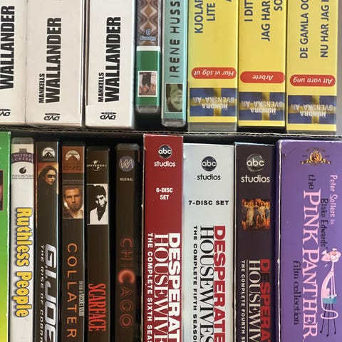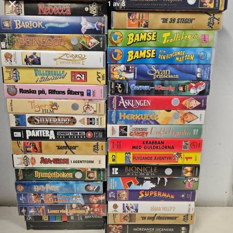 Samling VHS‑band av blandade märken i standardstorlek. Flera kassetter har handskrivna etiketter med olika filmtitlar och tv‑program. Plastkassetter i svart färg med pappersetiketter på rygg och framsida för märkning av innehåll. Lämpliga för uppspelning eller ominspelning i VHS‑spelare, samt för arkivering av analogt videomaterial.