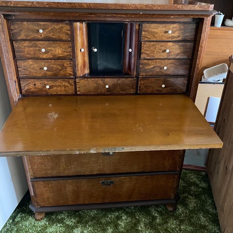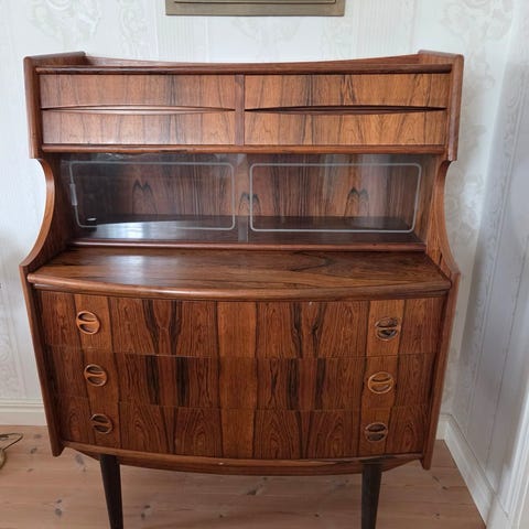 Sekretär skrivbord i brun träfaner med klaff som arbetsyta och flera små lådor och fack bakom klaffen. Underdelen har flera större utdragslådor med metallbeslag. Möbeln är lämplig som arbetsplats eller förvaring i vardagsrum, sovrum eller hall.
